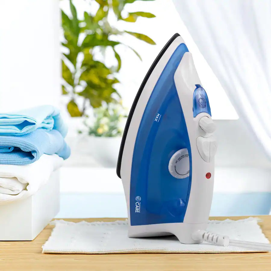 The Commercial Care CCSI800 Steam Iron delivers powerful 1200 watt performance in a portable lightweight design making it ideal for home travel or dorm use Its comfort grip handle provides precise control and comfortable handling while the nonstick soleplate glides smoothly over fabrics preventing residue buildup The adjustable temperature control allows safe ironing of a variety of materials from delicate synthetics to sturdy cotton Its 8.5 foot power cord offers flexibility during use and the iron combines portability convenience and durability to provide an efficient solution for everyday wrinkle removal tasks