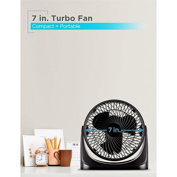 The Black+Decker BFTU107 7-Inch Turbo Fan delivers powerful personal cooling for small spaces Its compact design allows placement on desks tables or countertops while providing strong consistent airflow The adjustable tilt head enables precise directional control of airflow to target individual comfort needs Its lightweight portable construction allows effortless relocation between rooms and quiet operation ensures minimal disruption in offices bedrooms or workspaces The durable build and reliable motor provide long-term performance maintaining consistent airflow and improved comfort