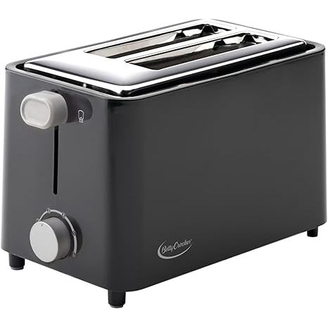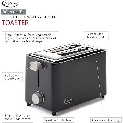 The Betty Crocker BC2605CB-B 2-Slice Cool Wall Toaster is a compact and efficient kitchen appliance designed to provide evenly toasted bread slices. It features adjustable browning control that allows users to select their preferred level of toast and a removable crumb tray for easy cleaning and maintenance. The toaster has a cool wall design that keeps the exterior safe to touch during operation. Its sleek black finish complements any kitchen decor while delivering reliable performance. This toaster is suitable for daily use and offers convenience, safety, and efficiency for a variety of breakfast preparations.