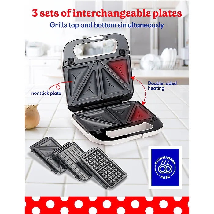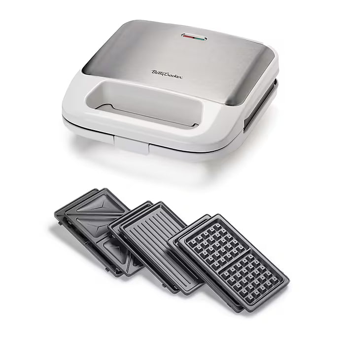 Betty Crocker BC4965 3-in-1 Indoor Grill Sandwich Panini and Waffle Maker Plus with Interchangeable Nonstick Plates Cool Touch Handle and Power Ready Indicator