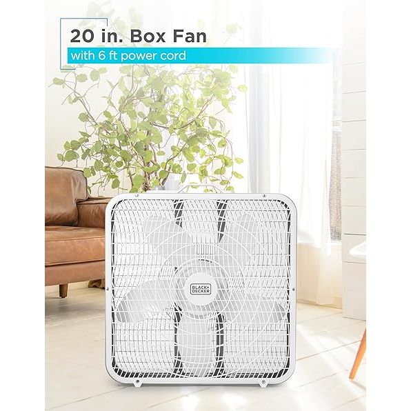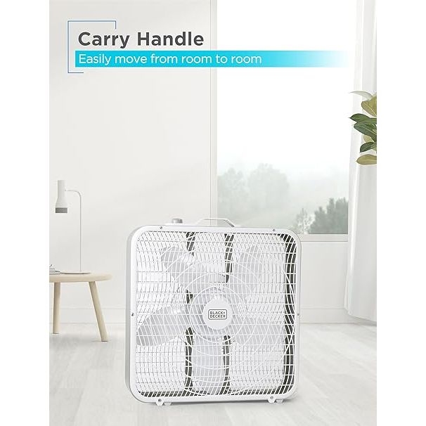 The Black Decker 20-Inch Portable Box Fan delivers powerful and efficient airflow to keep rooms cool and comfortable. Its adjustable speed settings allow users to customize airflow intensity for different cooling needs in bedrooms offices or living spaces. The lightweight design with a built-in carrying handle makes it easy to move and position the fan wherever needed while the recessed construction provides safe and convenient operation. Designed for durability the fan operates quietly and reliably providing consistent performance for everyday use. This fan combines portability efficiency and effective air circulation to enhance indoor comfort.